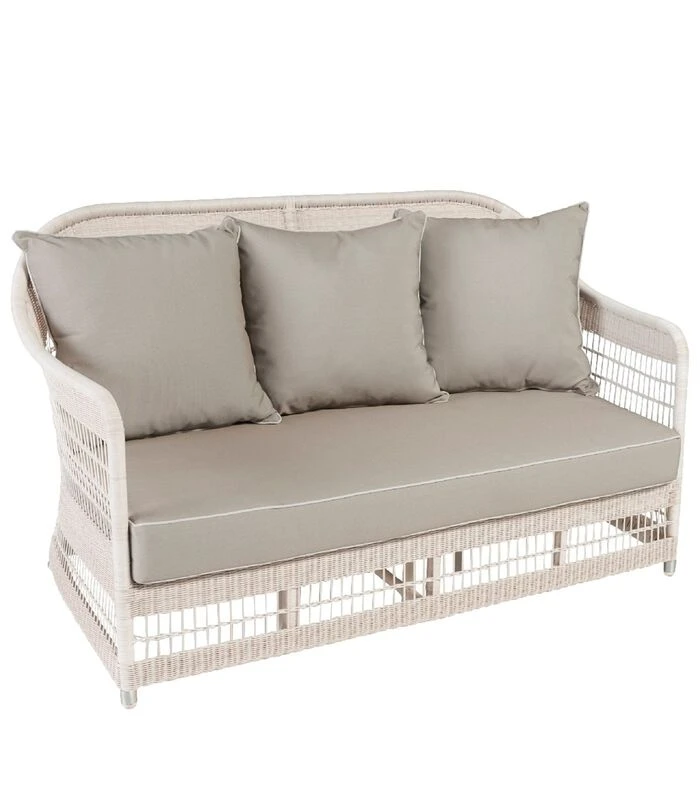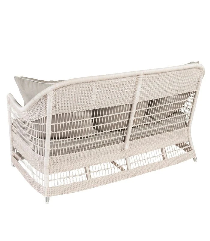 De tuinbank in rotan outdoor Biarritz neemt de stijl over van het meubilair dat te vinden was op de terrassen van koloniale huizen. De gebruikte Kunstvezel lijkt ongelooflijk veel op een witte, zijn naam: “”synthetische rotan””. Dit maakt het mogelijk een lichte, visueel zeer luchtige en weerbestendige zitting te hebben. Resistent tegen klimatologische risico’s: regen, sneeuw, zon, zeezout en zwembadchloor, onze kunstKunstvezel collectie is ontworpen voor gebruik buitenshuis: HDPE (High Density Polyethylene) met anti–UV behandeling, gegarandeerd tussen –15°C en +55°C, aluminium structuur met poedercoating, 100% polypropyleen buitenkussenbekleding, anti–UV en anti–schimmel behandeling. Overige afmetingen: hoogte 81 x breedte 139 x diepte 81, zitting 41 cm (met kussen), structuur aluminium met poedercoating, vlechtwerk van HDPE–Kunstvezel, stof 100% olefine, polyetherschuim 30kg/m3 voor de zitting, polyestervezel voor de rug. Gemaakt in Indonesië .