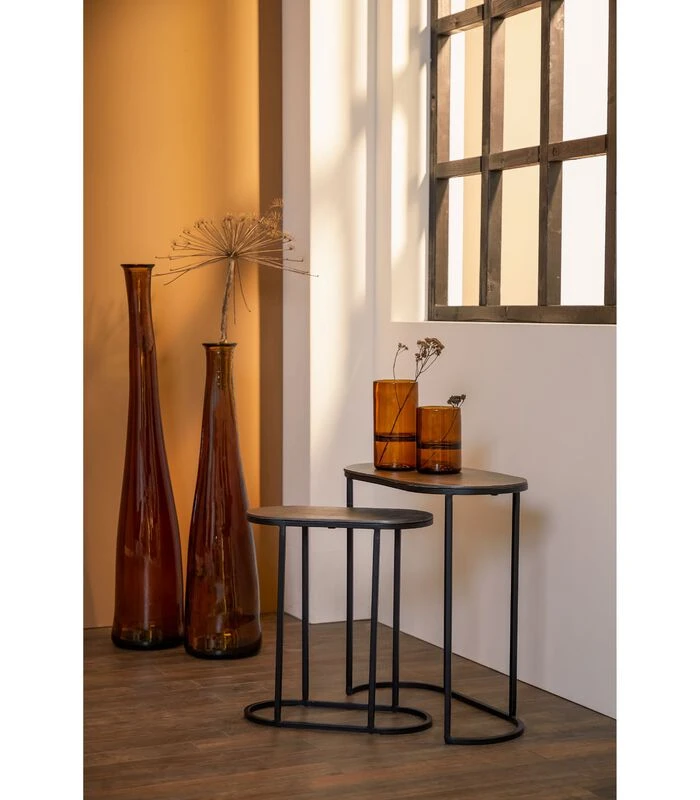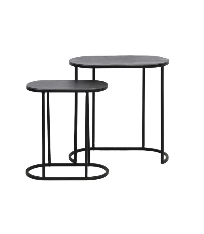 Bijzettafels zijn een musthave in elk interieur. Deze Bocov bijzettafeltjes hebben een antiek loden tafelblad en een zwart onderstel, wat een industrieel effect geeft. Deze tafeltjes komen in een set van twee, waardoor je niet meer hoeft na te denken welke tafeltjes wel of niet bij elkaar passen. De tafels passen onder elkaar waardoor ze niet zo veel ruimte in nemen. Je kan ze natuurlijk ook uit elkaar schuiven, wat zorgt voor een leuk en speels effect. Zet de bijzettafeltjes in de woonkamer bij de bank zodat je lekker je kopje koffie of snacks er op kan zetten. Wij raden wel altijd aan om onderzetters te gebruiken. De tafels hebben een afmeting van maximaal 53x26x53 cm en zijn een product van het Nederlandse merk Light & Living.