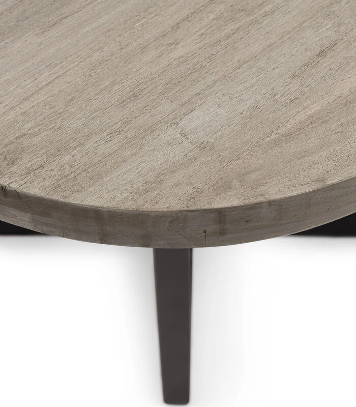 Een bijzettafeltje voor binnen of buiten met donkerbruine metalen poten en een mooi rond blad van teakhout met een diameter van 56 cm. De vier metalen poten gaan kruiselings naar het midden. Het tafeltje is heel eigentijds en heeft een industriële look.