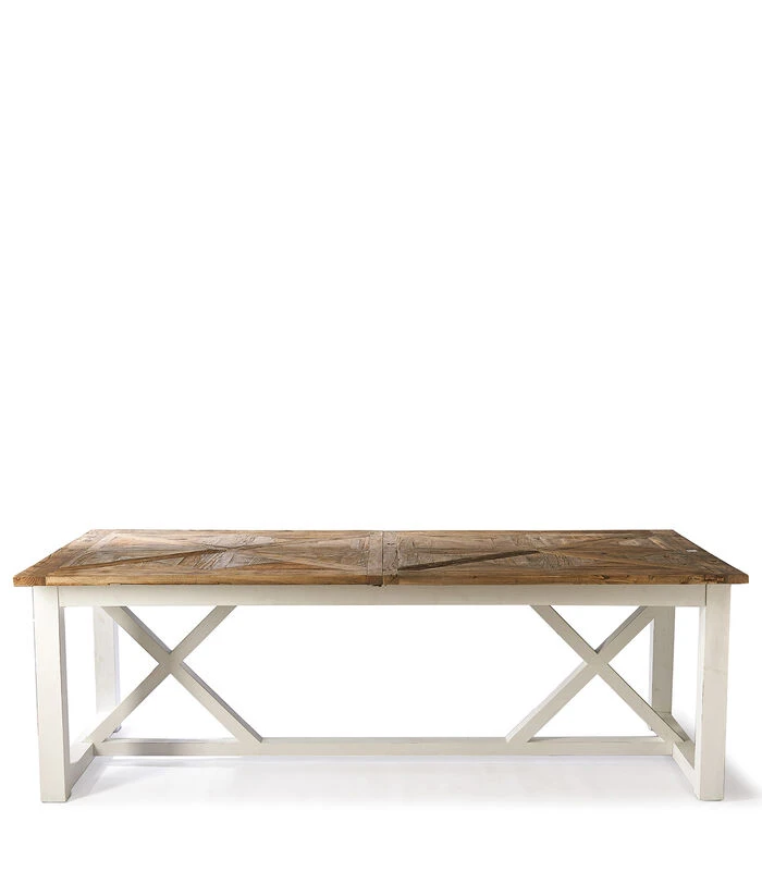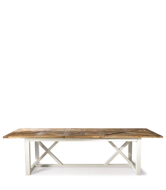 Een grote tafel mag altijd nog groter. Deze tafel is al niet klein van zichzelf met zijn 2,30 meter, maar als het gezelschap uitgroeit, groeit de tafel gewoon mee. Tot 3 meter, om precies te zijn. In het midden zit een blad dat kan worden opengeklapt als de twee uiteinden uit elkaar worden geschoven. Gemaakt van gerecycled iepen– en dennenhout.