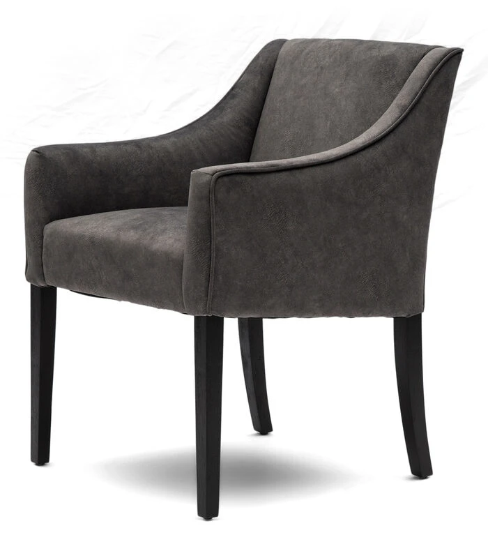 Dit is de eetkamerstoel uit de Savile Row–serie in de kleur ‘Elephant’ (Berkshire–stof). Het is een strak vormgegeven stoel met armleuningen. De armleuningen lopen geleidelijk omhoog richting de rugleuning. De poten zijn gemaakt van rubberwood en de stof van polyester. Ook verkrijgbaar in andere materialen en kleuren.