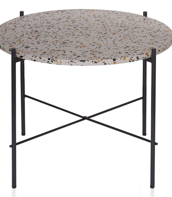 Vayen is een luxueuze, slanke bijzettafel uit de collectie van het Nederlandse merk WOOOD Exclusive. Het tafelblad is vervaardigd uit terrazzo, wat ervoor zorgt dat elk tafelblad een uniek uiterlijk heeft. De basis van het tafelblad is lichtgrijs en het kleurenspel van de steen elementen heeft een warme, aardse kleur.