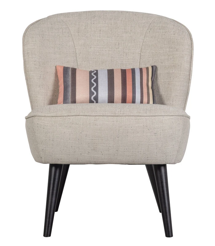 De fauteuil is gemaakt van een 100% polyester stof in een naturel tint en is voorzien van een kleurrijk key piece kussen voor extra comfort. Lonneke heeft een hoogte van 71 cm, breedte van 59 cm en diepte van 70 cm. De zithoogte is 44 cm, zitbreedte 56 cm en poothoogte 25 cm. Artikelkenmerken
