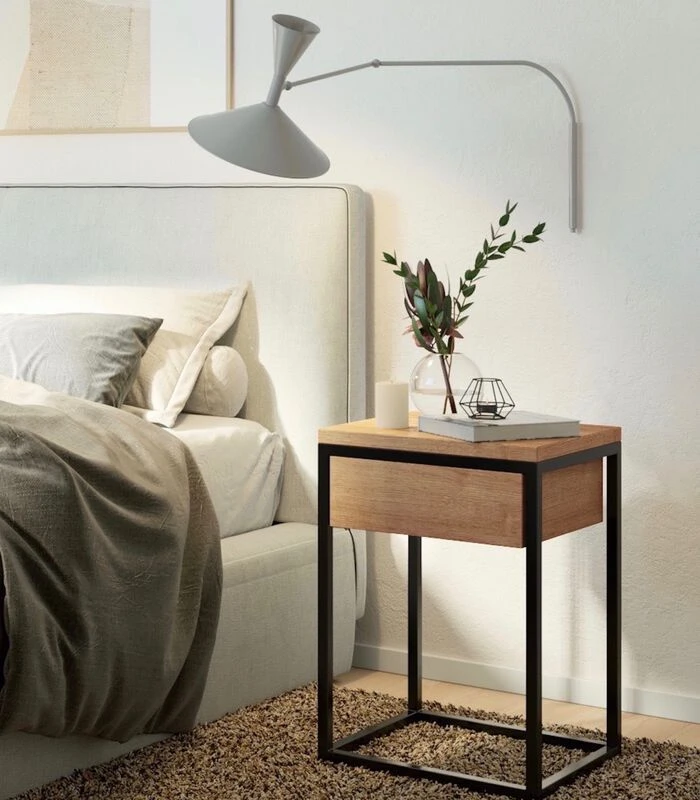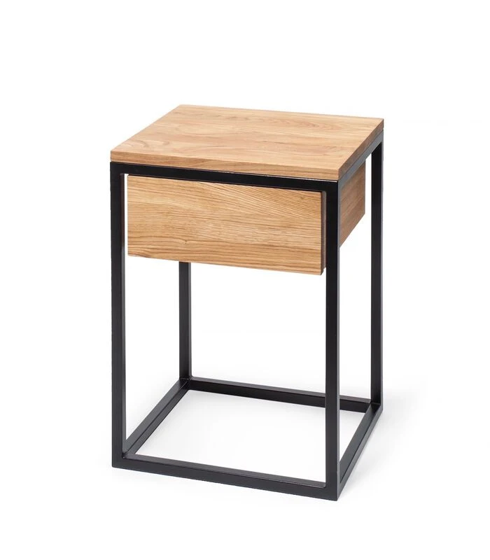 Dit nachtkastje is de perfecte fusie tussen massief eiken en een zwart metalen structuur, wat het een chique en industriële stijl geeft. De natuurlijke olieafwerking brengt de schoonheid van de houtnerf naar voren. De lade is diep en biedt een ideale ruimte om je bedbenodigdheden op te bergen. Je kunt ook een lamp bovenop de tafel plaatsen.