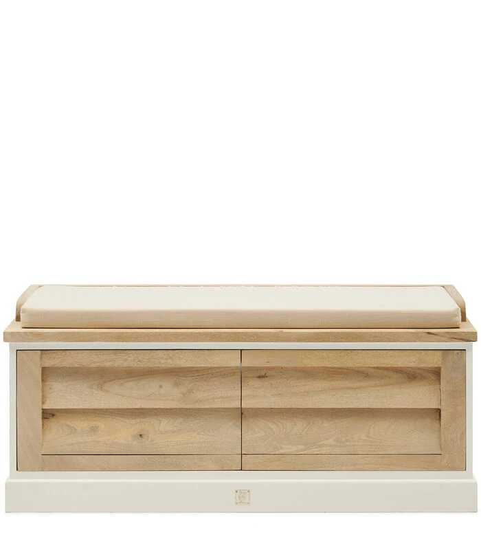 Een multifunctioneel bankje handgemaakt van duurzaam mangohout. De mangoboom wordt pas gekapt als hij helemaal geen vruchten meer produceert. Zo krijgt de boom een tweede leven in onder meer de meubelbranche. De bekleding van dit bankje is van katoen. Het bankje heeft opbergruimte.