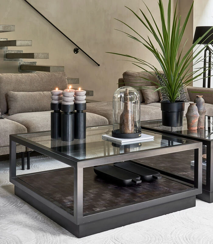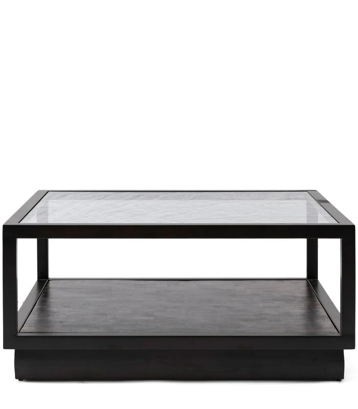 Salontafel Roger is een mooi voorbeeld van strakke elegantie. Deze tafel heeft namelijk een opengewerkte structuur, die samen met het glazen topblad een luchtige uitstraling geeft. De tafel heeft een frame van zwart metaal in een poedercoating. Op het frame zijn onderin een mangohouten blad bevestigd met een warmgrijze beits.