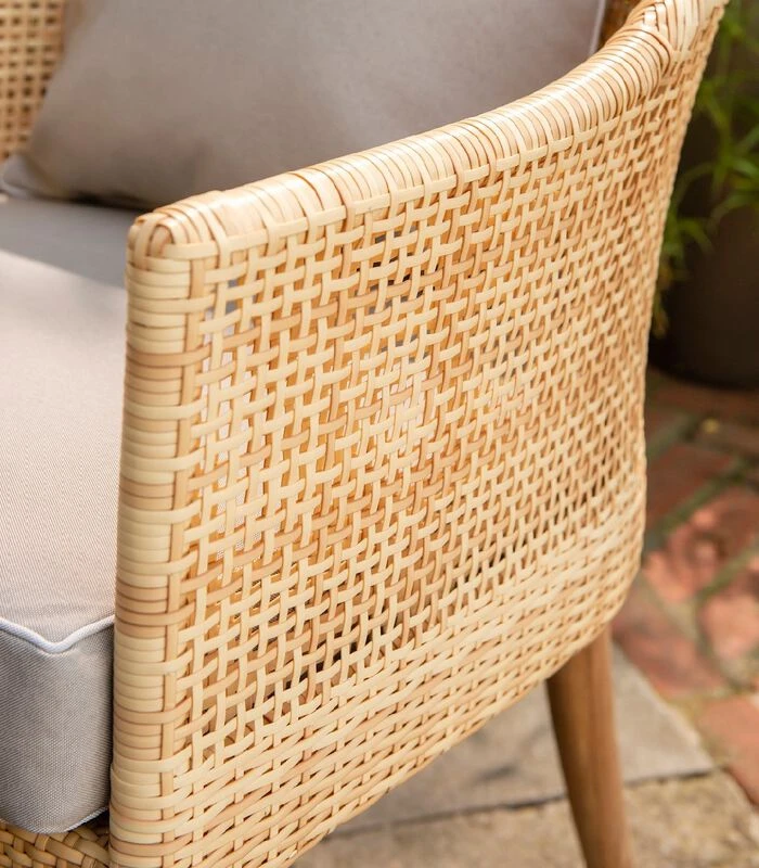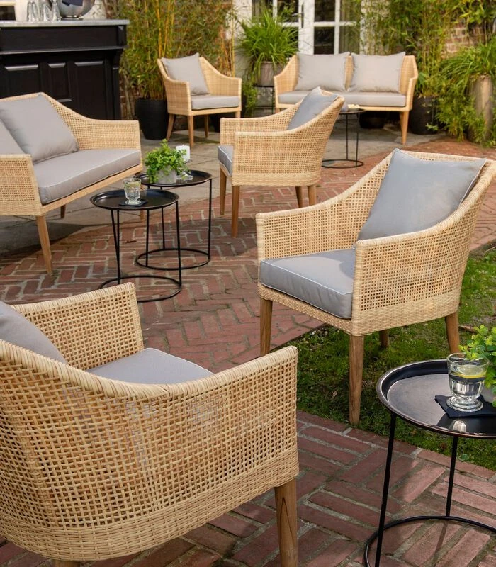 De Sao Polo hars fauteuil combineert de geruststellende robuustheid van een natuurlijke teak en aluminium structuur met het raffinement van een opengewerkt vlechtwerk in HDPE (hoge dichtheid polyethyleen) hars, geëxtrudeerd in een reeks van blonde kleuren om de nuances van een natuurlijke vezel te reproduceren. Een prachtig handgemaakt werk van KOK MAISON. Ontworpen voor gebruik buitenshuis, zal het natuurlijk zijn plaats vinden in de tuin of op het terras, maar zijn weerstand tegen slecht weer gaat gepaard met een verhoogde robuustheid voor intensief gebruik, het zal ook geschikt zijn voor professioneel gebruik binnenshuis of semi–binnenshuis: restaurantzalen, spa’s, loges, hotelkamers, enz…