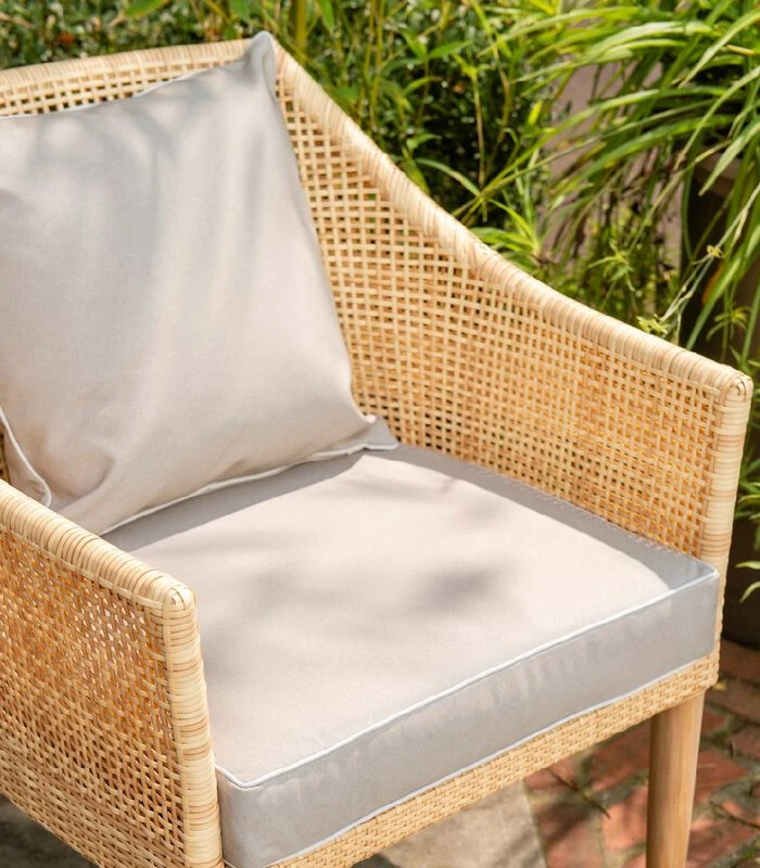Poten in natuurlijk teakhout, aluminium frame. Gevlochten HDPE hars. Nylon glijder onder elk been. Afmetingen: H 75 x B 63 x D 68 cm. Zithoogte 44cm met kussen. Gewicht: 7,5 kg. Hier geleverd met uitneembaar kussen in polyetherschuim 30 kg/m3 voor de zitting en in polyestervezel voor de rug, 100% olefinic bruine stof, UV–, weer– en schimmelbestendig, koud wasbaar. Gemaakt in Indonesië (zitting en kussen). Het kussen kan op verzoek worden gestoffeerd met de stof van de klant. Neem contact met ons op voor details.