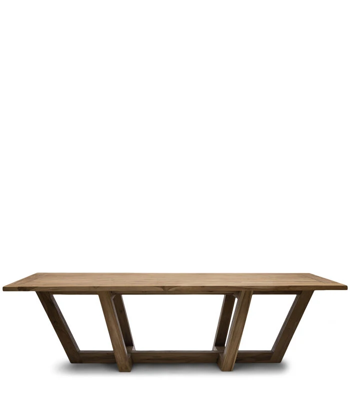 Eindeloos tafelen met zijn allen tijdens mooie zomeravonden, daar is ruimte genoeg voor aan deze tafel. Het blad is van stevig teakhout, de poten ook. Die rusten op één lange balk onder met daarop aansluitend de zijpoten. Daardoor is de tafel erg stevig. Deze eettafel is er in twee maten.