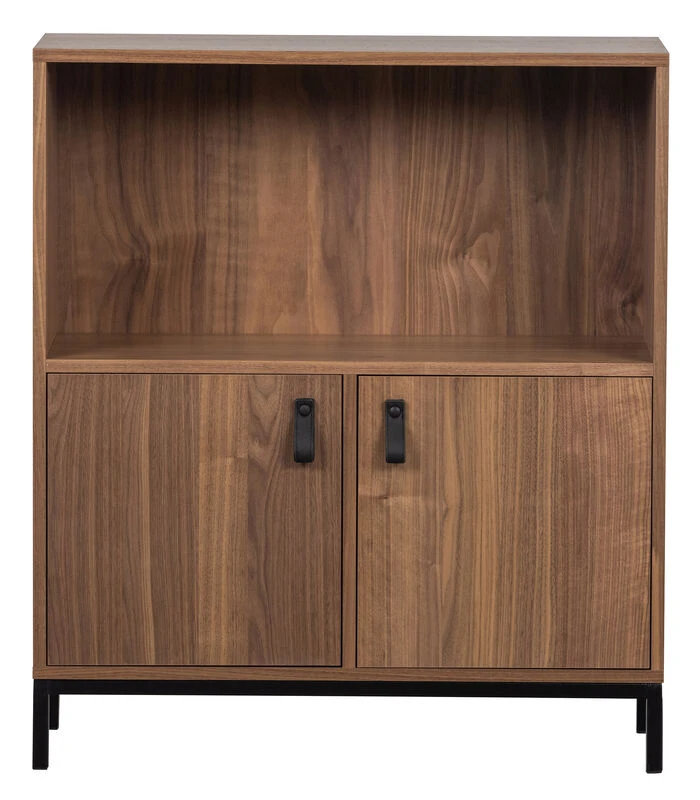 Bookazine is vervaardigd uit notenhout fineer met een bruine afwerking. Dit geeft de boekenkast een warme uitstraling. De zwart leren handgreepjes in combinatie met het zwart metalen onderstel geven de boekenkast tevens een modern en stoer karakter. Het zwarte onderstel is vervaardig uit metaal met een matte poedercoating.