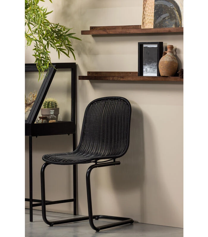 De buisframe eetkamerstoel is 84 cm hoog, heeft een zithoogte van 45 cm en staat op 44 cm hoge poten. De breedte en zitbreedte van de stoel is 44 cm en zitdiepte bedraagt 42 cm. De rugleuning heeft een hoogte van 41 cm en een breedte van 42 cm. Het frame van matzwart metaal is ø 2 cm. De eetkamerstoel kan een maximum van 150 kg dragen.