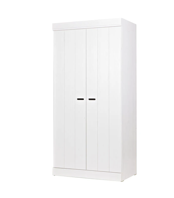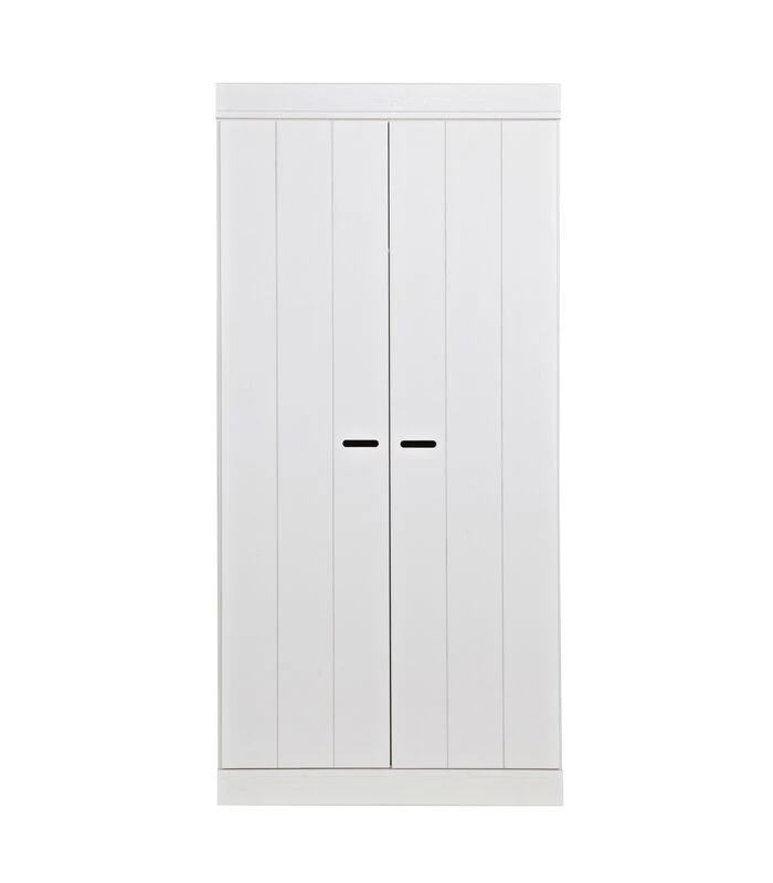 Uit de serie CONNECT: een stoere basic kast met strakke sokkel en koof gecombineerd met strokendeuren met sleuven. Met de CONNECT kasten kun je je eigen kastenwand bouwen! In de hal, slaap– of kinderkamer: CONNECT past in iedere ruimte! Als losse kast of als meerdere kasten aan elkaar gekoppeld. De romp van de CONNECT kast is gemaakt van massief grenenhout. De binnenzijde is voorzien van een spaanplaat/melamine interieur, erg praktisch met schoonmaken. De kasten zijn in de kleur wit gespoten, maar je schildert ze binnen een handomdraai ook in een andere kleur. De serie CONNECT bestaat uit een ladekast en 3 basiskasten: Een 2–drs kast, een 2–drs kast met lades en een 3–drs kast met lades. De kasten zijn zo gemaakt dat ze vlak tegen elkaar aan kunnen worden geplaatst. De kasten kunnen perfect naast elkaar geplaatst worden en zo kun je de kast zo breed maken als je zelf wilt. Wij adviseren de ladekast tussen twee kasten te plaatsen en dat er niet met deze kast wordt geëindigd (zoals afgebeeld). Dit omdat de ladekast minder diep is dan de andere kasten. De 2–drs en 3–drs kasten zijn beschikbaar met twee typen deuren: een strokendeur met sleuven als handgreep of de stoere lockerdeur met wit metalen grepen. De CONNECT kasten zijn verkrijgbaar met het standaard hang–/leg interieur (1 roede + 1 legplank) of met een aanvullend interieur, bevattende een tussenschot en 3 gedeelde legplanken. De kasten CONNECT worden geleverd als eenvoudig bouwpakket met een duidelijke montage–instructie.
