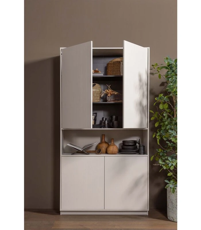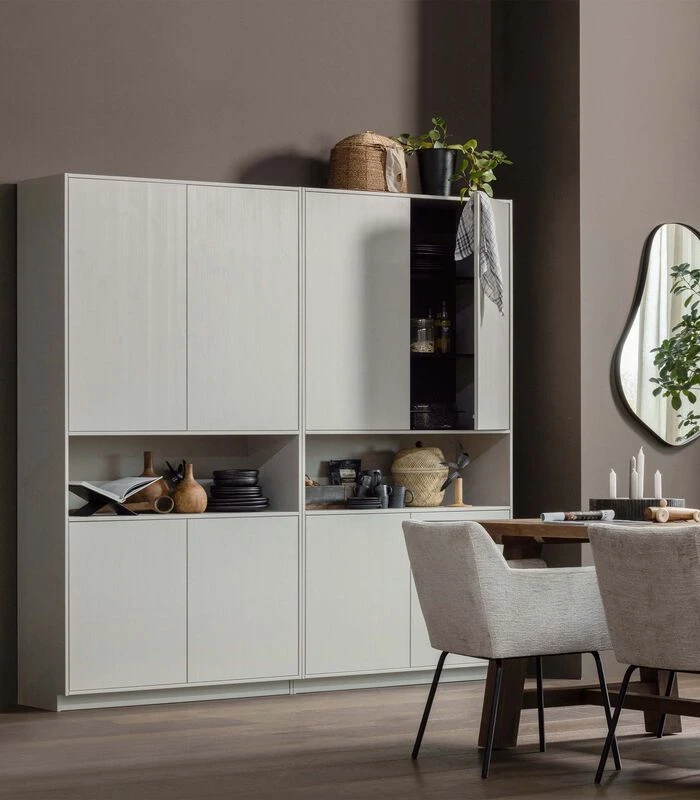 De Finca buffet–/opbergkast 110 cm is de brede variant, de smalle buffetkast is een 1–deurs van 40 cm breed. De bovenste twee deuren van de Finca buffetkast dekken drie handige opbergvakken af. Hieronder bevindt zich een open vak voor het presenteren van jouw mooiste woondecoratie. De twee onderste deuren houden nog eens twee ruime opbergruimten uit het zicht. De twee bovenste – en twee onderste vakken hebben elk een hoogte van 32 cm, een breedte van 108 cm en een diepte van 37 cm. De twee vakken in het midden hebben een hoogte van 34 cm. De onderrand van de buffetkast laat 7 cm ruimte over aan de voorzijde, hierdoor lijkt het meubel te zweven.