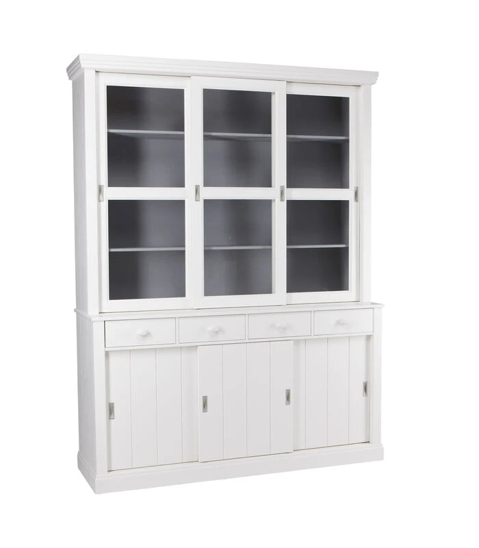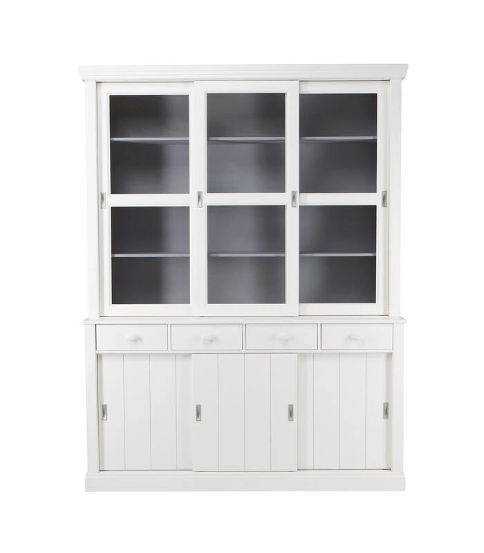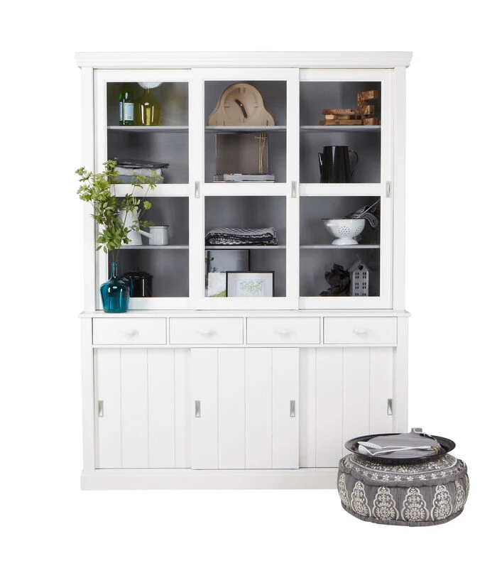 Laat zien wat je in huis hebt! Waar kan dat beter dan in deze landelijke winkelkast Lagos van het merk WOOOD? Gemaakt van brede houtplanken met glazen schuifdeuren is de kast robuust en open tegelijk. De winkelkast is gemaakt van massief, FSC gecertificeerd, grenenhout en heeft een witte afwerking. De achterwand is van MDF en de kast is voorzien van spaanplaat legplanken. De binnenzijde heeft een grijze afwerking. In de bovenste schuifdeuren is veiligheidsglas (gehard glas) verwerkt. De winkelkast is voorzien van drie onder– en drie bovenschuifdeuren met daartussenin vier lades met houten knop.